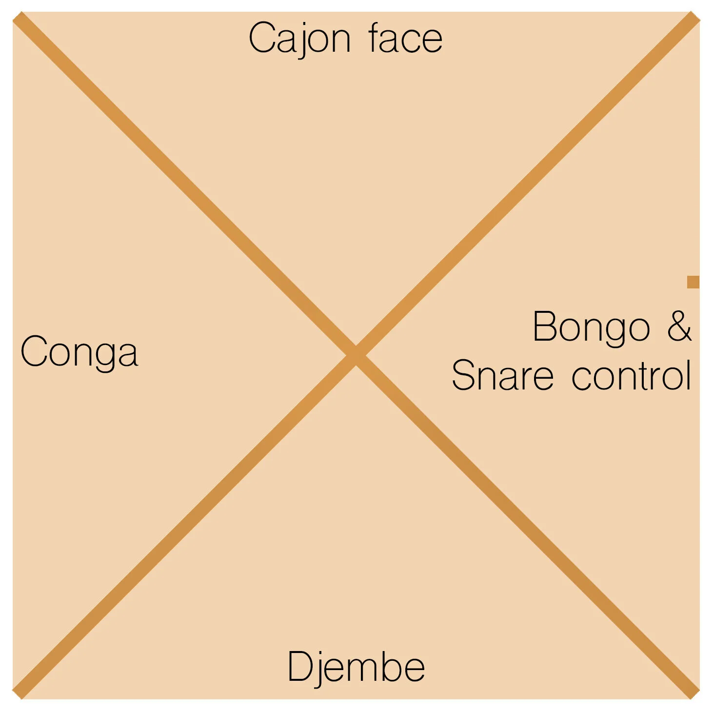 The front face is a contemporary Cajon with a one-touch, micro-adjustable snare. The tonal response of this face without the snare dialed is diverse and rich. Working around the drum from the Bongos is a Djembe and a Conga. The melodic potential is astounding, as various faces can be played in unison to create melody, for standout soloing or as accents in a groove. As standalone instruments any one of these faces would be special but together they represent one of the most refined and versatile hand percussion instruments of its kind.