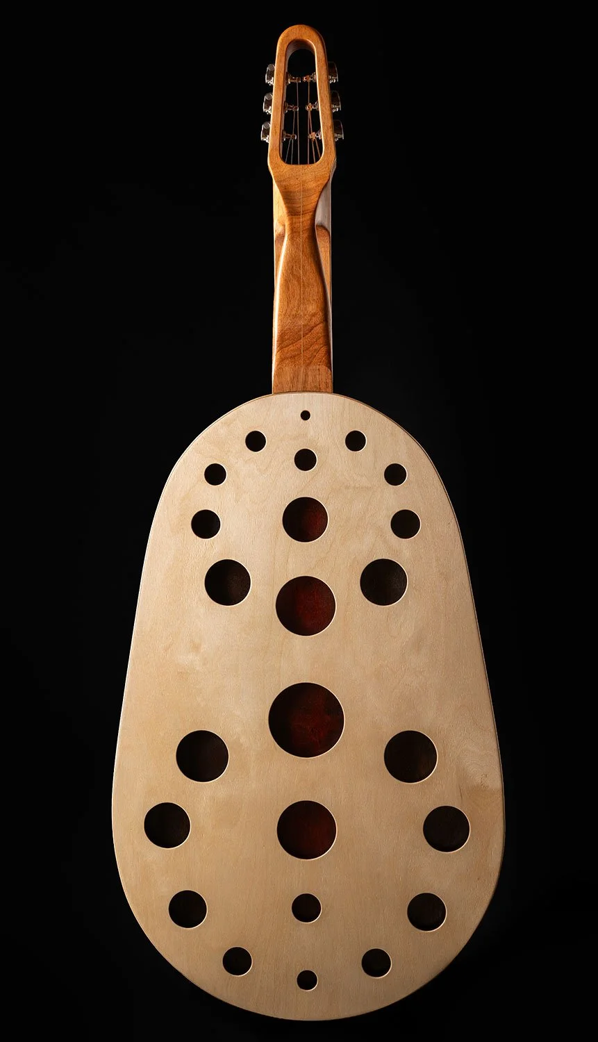 If each of these areas is working efficiently, there should be a huge wash of energy into the sound chamber and onto the back of the instrument, which absorbs and propagates that energy. Then the chamber holds and colours the tone. These instruments have a top circular top soundboard.